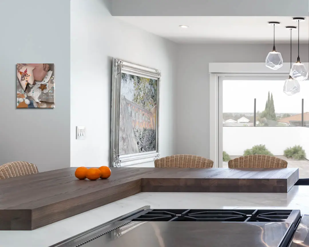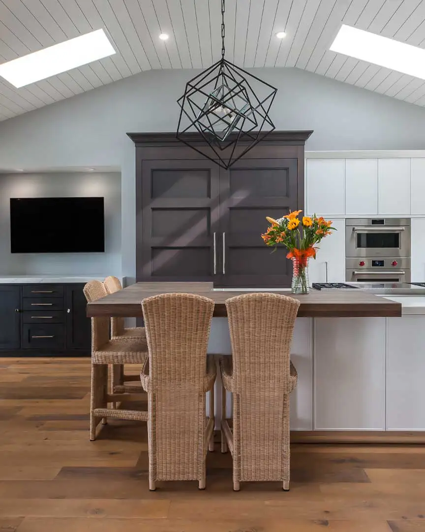 Modern kitchen interior design in La Jolla featuring a custom wooden countertop with fresh oranges, stylish wicker chairs, and contemporary pendant lighting. The room highlights premium cabinet and storage solutio