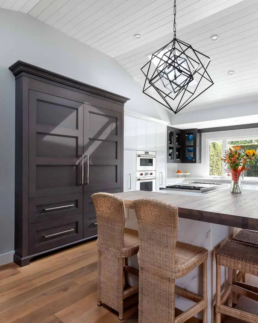 Modern kitchen with custom cabinetry in La Jolla, featuring dark wood cabinets, a light wooden island, rattan bar stools, and a geometric pendant light. Premium design elements and ample storage solutions are highlighted.