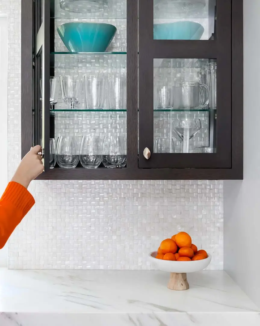 Custom dark wood kitchen cabinet with glass doors displaying glassware and a turquoise bowl, set against a white mosaic tile backsplash. Hand opening the cabinet door; a bowl of oranges sits on a white marble countertop. Premium custom cabinetry and storage solutions by Interior Design Studio La Jolla.