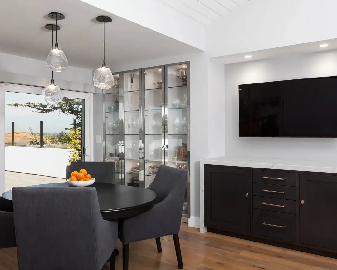 Modern dining room with custom cabinetry in La Jolla interior design studio, featuring a round table with dark upholstered chairs, pendant lighting, and a glass cabinet showcasing elegant glassware.