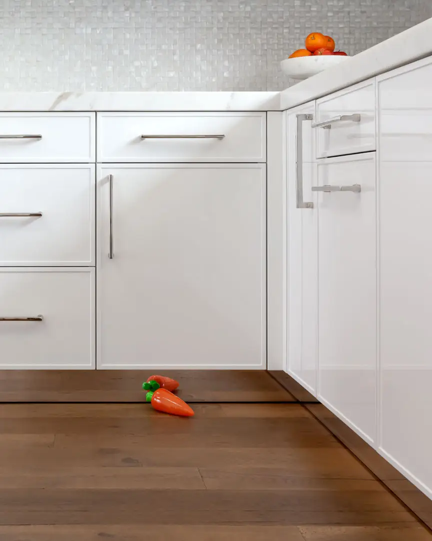Sleek white custom cabinetry with modern handles in a kitchen setting, featuring a bowl of oranges on the counter and toy carrots on the polished wooden floor, showcasing premium storage solutions.