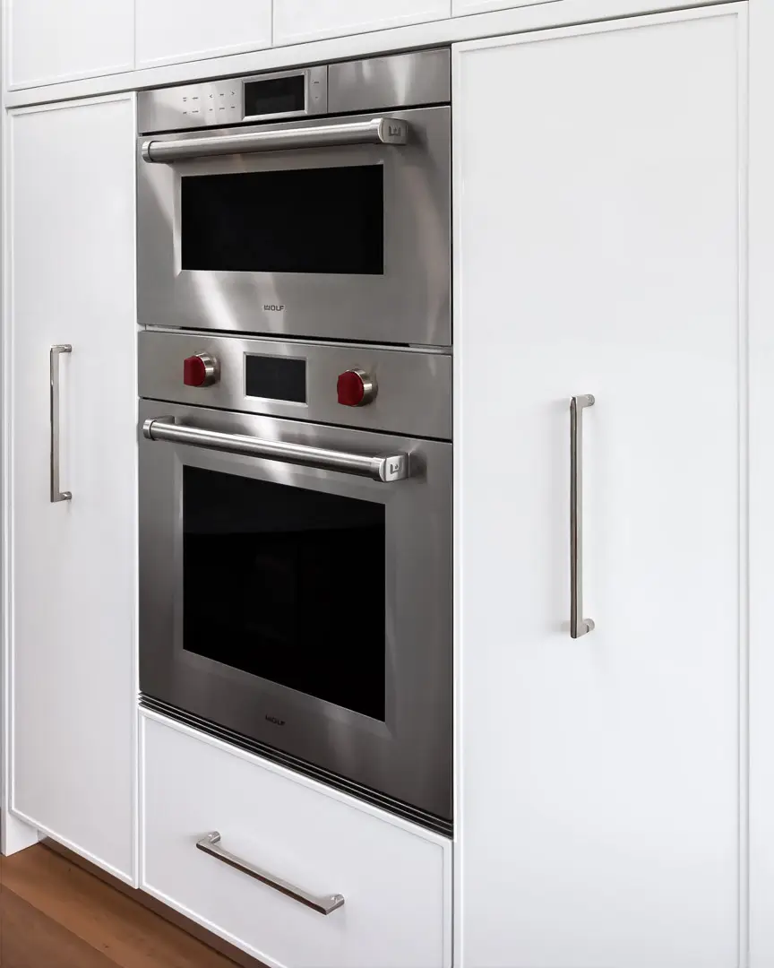 Modern kitchen with built-in dual stainless steel ovens in sleek white cabinetry, showcasing premium custom design and storage solutions in La Jolla.