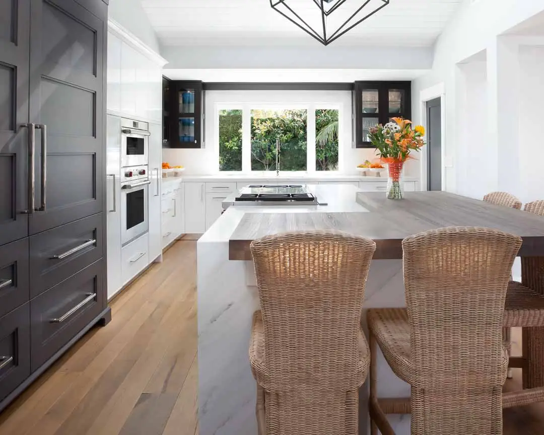 Modern kitchen interior with custom cabinetry in La Jolla, featuring a large island with wicker bar stools, contemporary lighting fixture, built-in stainless steel appliances, and a vase of flowers on the counter.
