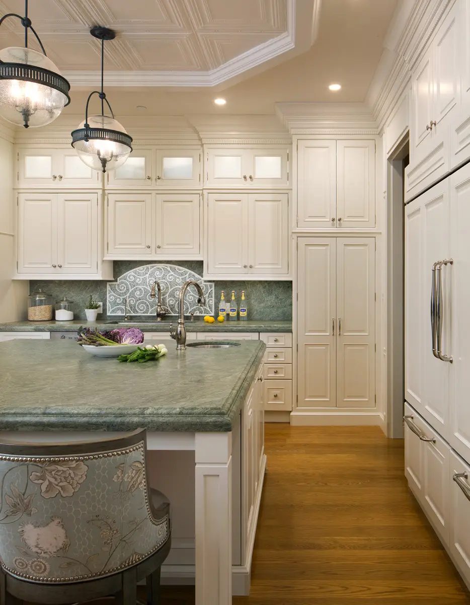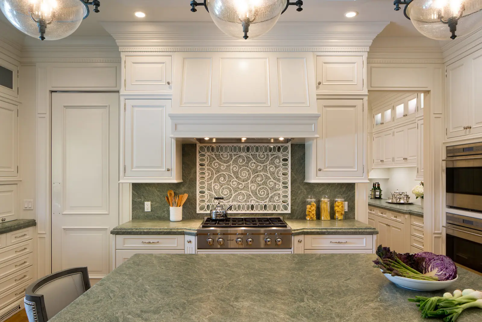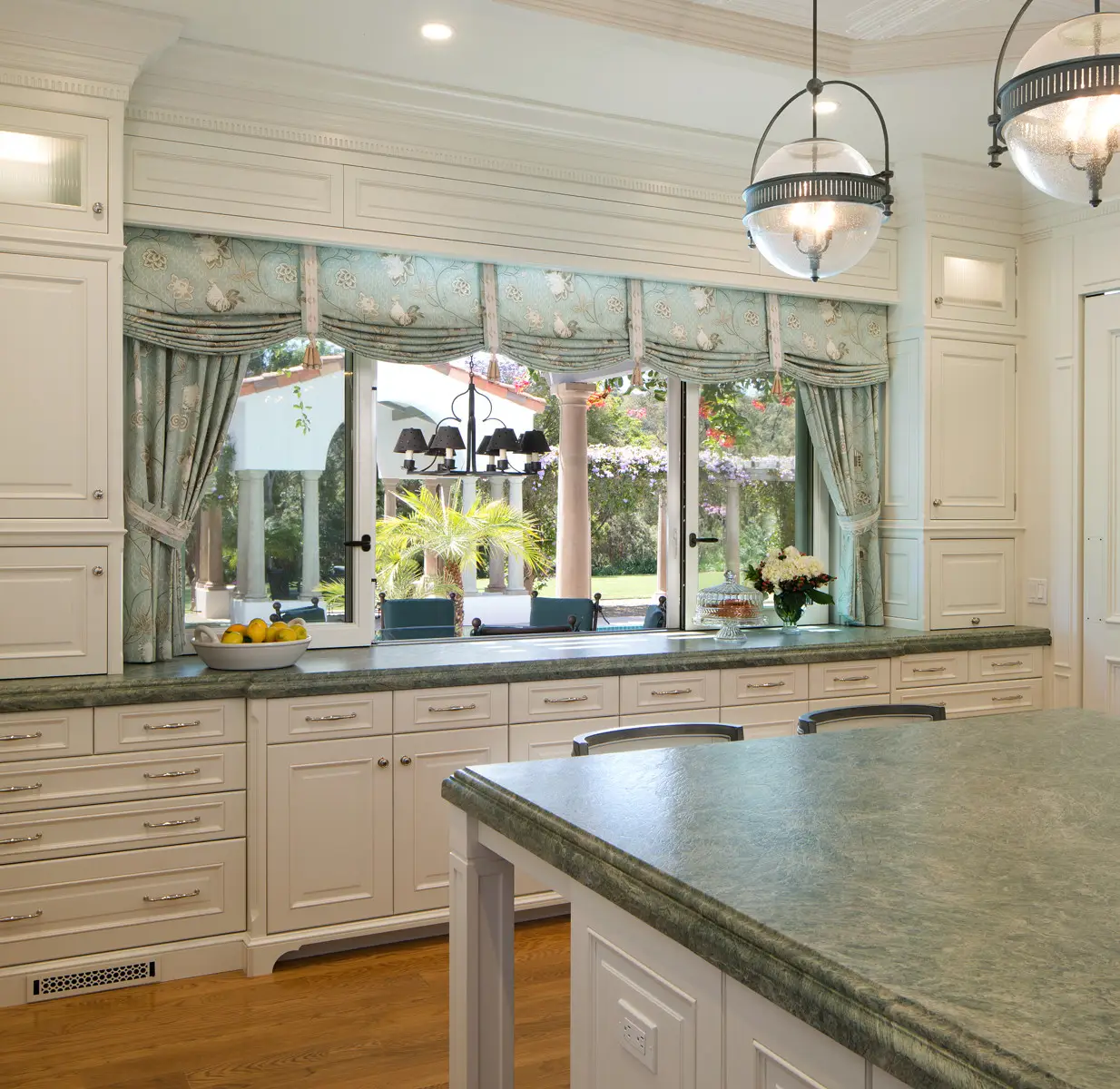 Elegant modern kitchen in San Diego featuring bespoke white cabinets, green marble countertops, stylish hanging pendant lights, and a large window with decorative teal curtains, offering a view of the garden. Elegant modern kitchen with custom white cabinets, green marble countertops, and a decorative tile backsplash in San Diego. Featuring a spacious island with chairs, pendant lighting, and integrated appliances, designed by Inplace Studio. Elegant kitchen hallway in San Diego with custom white cabinets and green marble countertop, featuring decorative silverware and flowers, wooden flooring, and recessed lighting. Elegant modern kitchen in San Diego with bespoke white cabinets, green marble countertop island, ornate backsplash, and pendant lighting. Designed by Inplace Studi